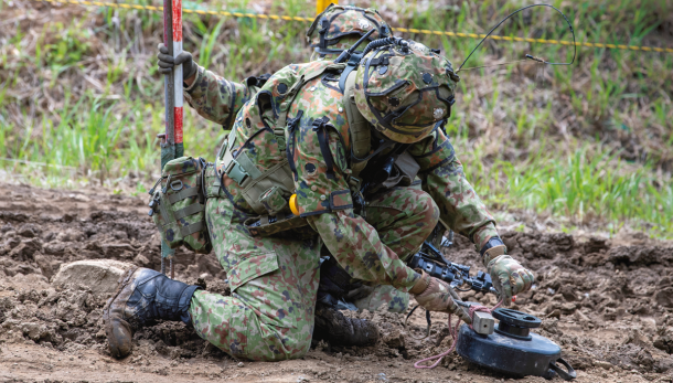 さらに赤部隊を追い詰めるべく前進する青部隊は、経路上に地雷原を発見。そこで、施設科隊員が直接爆発物を仕掛け、誘爆処理する昔ながらの方法をとった。終了後、90式戦車がそこを通ろうとした際に、審判から「まだ地雷は残っている」というジャッジが下され、さらにもう一度同じ爆破作業を行う一幕も見られた。別の場所では、ドローンから地雷原に爆発物を投下して、誘爆処理する珍しい方法も試した。