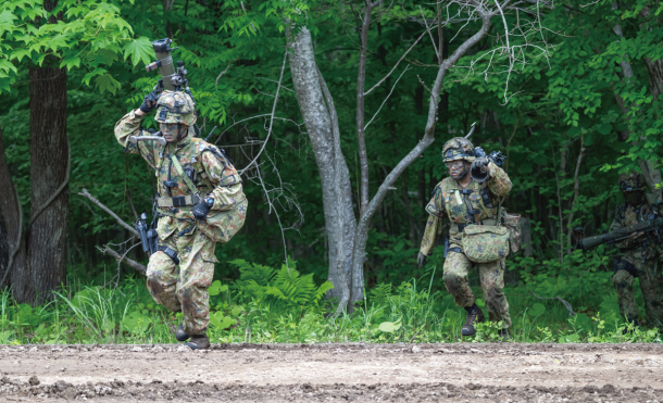 青部隊の89式装甲戦闘車の後部ハッチから、普通科隊員が下車した。赤部隊の10式戦車が遠くに見える。無反動砲などをかまえた隊員が林の中を駆け抜ける。その後方から、90式戦車が援護射撃をしていく。