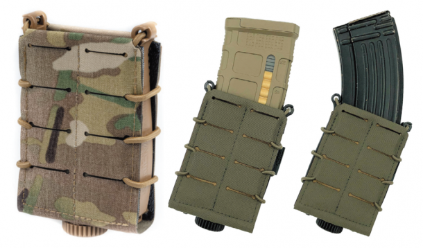 従来のマガジンポーチと異なり、ATACシリーズではAR系マガジン以外に7.62mmNATOマガジンやAKのマガジンにも対応できるよう設計。両側面の樹脂パネルが広がることで汎用性を高めている。