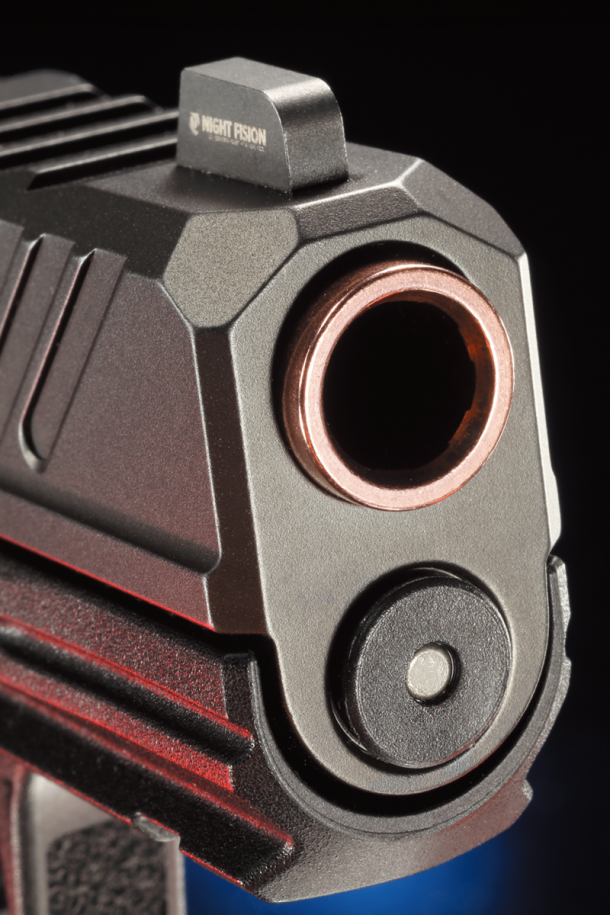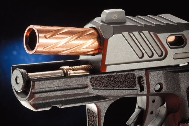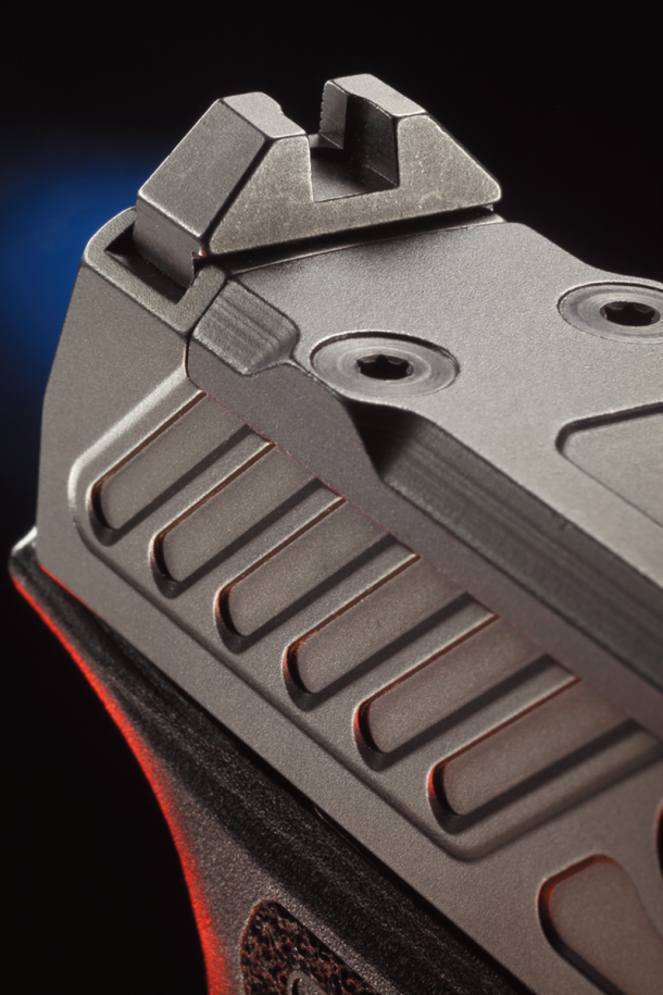 スライドに目を移すと、前後にある斜めセレーションは面を一段落としたポケットに彫られている。この斜め形状は、引きの食い付きは強固に保ちつつ、ホルスターから抜く際のフリクションが起こらないようにする工夫だ。一段落としはスライドを薄く感じさせる効果もある。スライドトップ部のセレーションは単なる飾りではなく、前方横のセレーションでスライドを引く際の更なる助けになり、またスライドの小窓は軽量化の意味合いだ。バレルのブロンズ色を強調する効果もある。