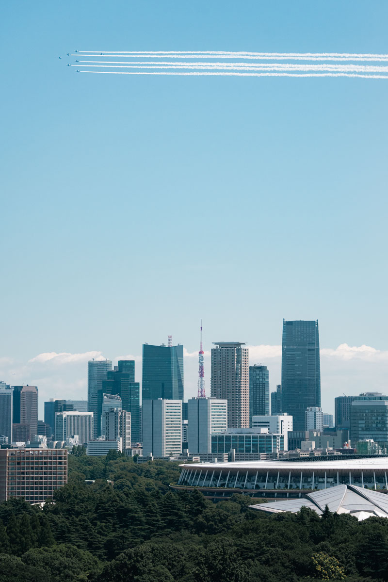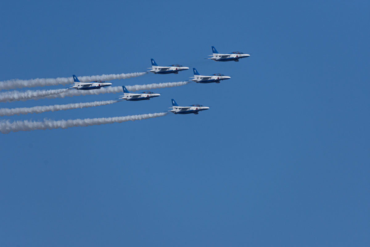 前述した大空を大きく使う演目や風景と掛け合わせて取る場合ブルーインパルスに合わせるより、風景にピントを合わせてあげた方がいい場合が多い。