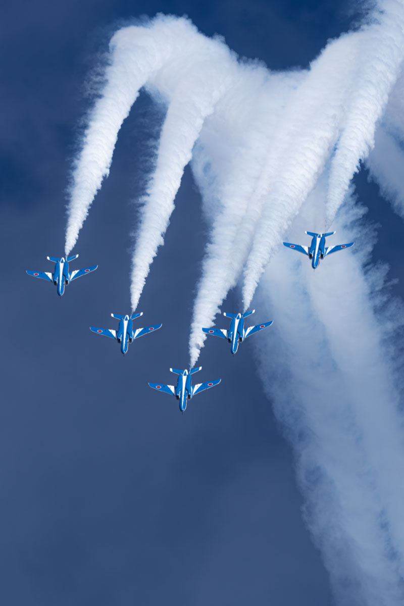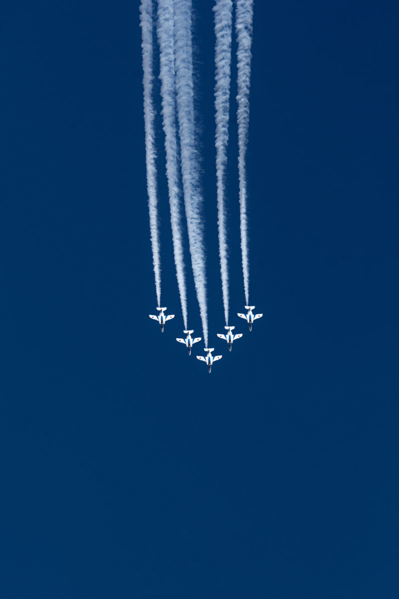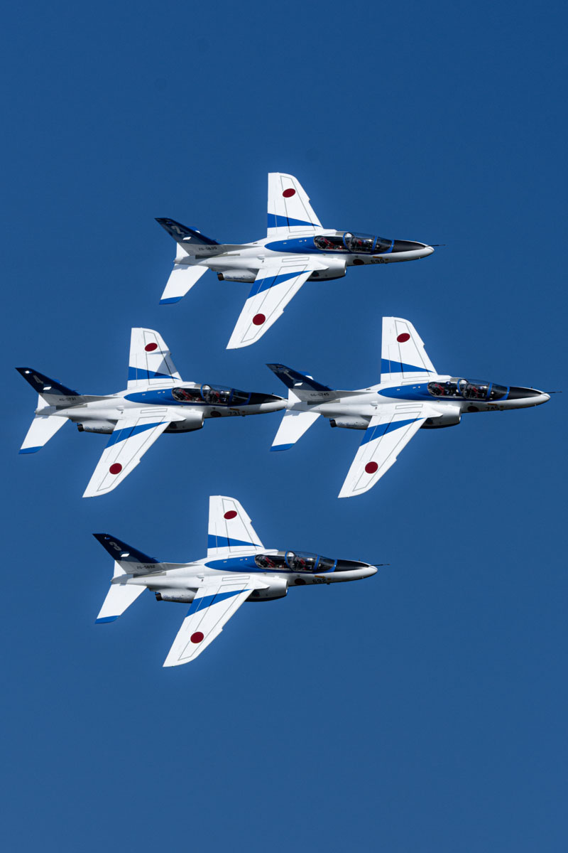 青と白でカラーリングされたT-4を駆る彼らは航空自衛隊の存在を多くの人々に知ってもらう為、航空祭や国民行事で展示飛行や通過飛行を披露する航空自衛隊の専門チームだ。