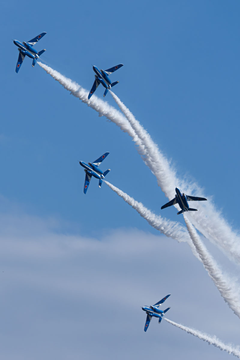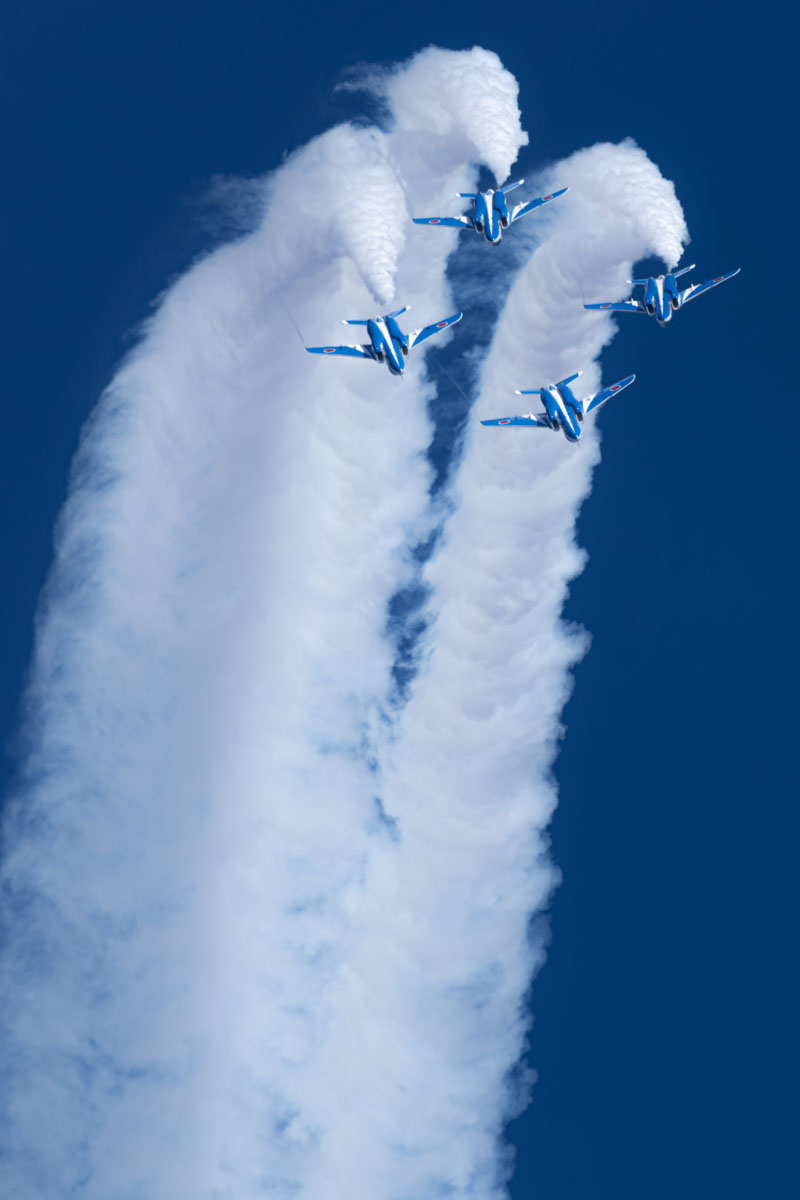 ブルーインパルスは航空機の中でも動きが速い部類だ、その為ブレないように早めのシャッタースピード(SS 1/1000以上)+白い機体に白いスモークで白飛びしないよう気持ち露出(明るさ)を抑えてあげることが大事になる。