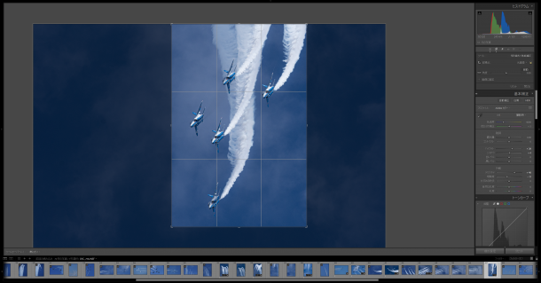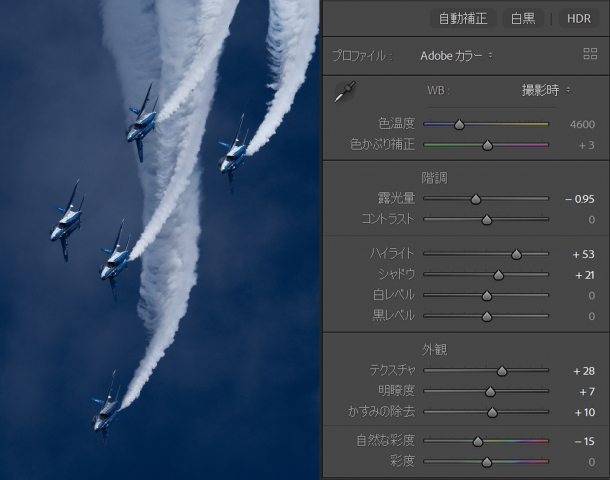 機体とスモークが白いため、『露光量』で全体の明るさを下げつつ『ハイライト』を上げることで簡単に空を深い青にしてブルーインパルスとスモークの白さを強調することが可能だ。