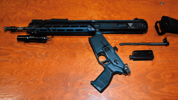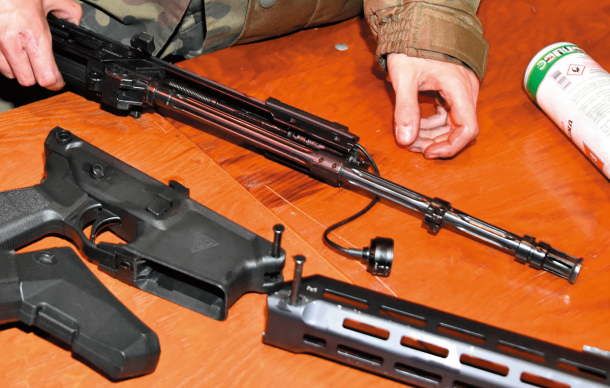 GROTはストックを外し、テイクダウンピンを引き抜くことで上下レシーバーを分割する。大雑把だが構造が理解しやすいAKMに比べて、丁寧に扱うべき対象という印象を持ったようだ。GROTの大きな特徴でもあるショートストロークガスピストンは文字通りの小さな部品で、煤を落とす際に床に落とすリスクがある。西側の銃器は精密な造りであり、確実な作動性を得るためにも正しい整備を理解する必要がある。異なる時代の銃器を学ばせる機会は訓練生の知識をより高めるだろう。