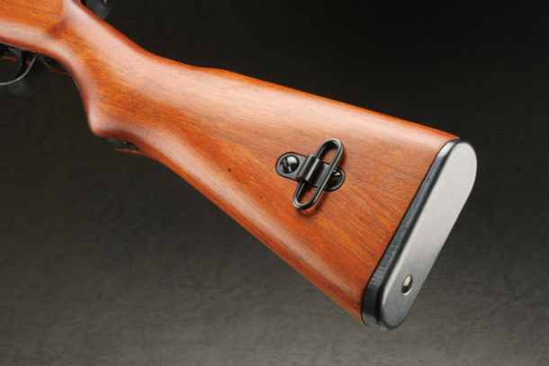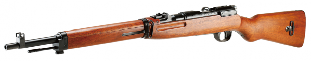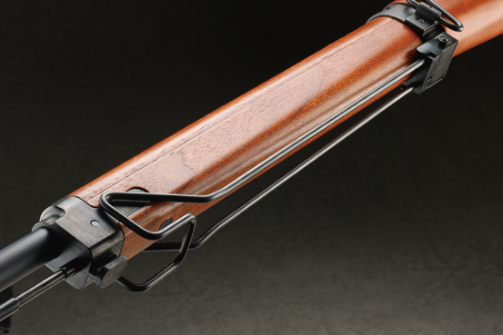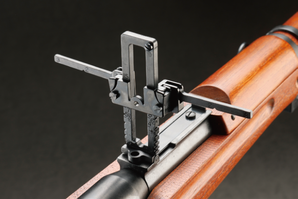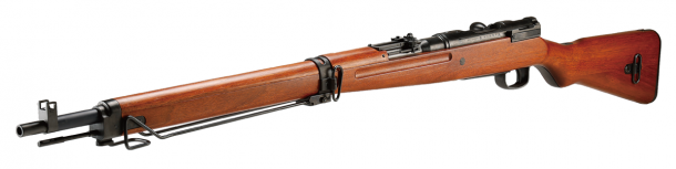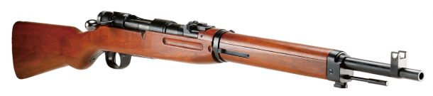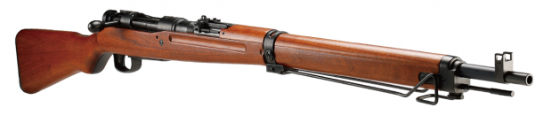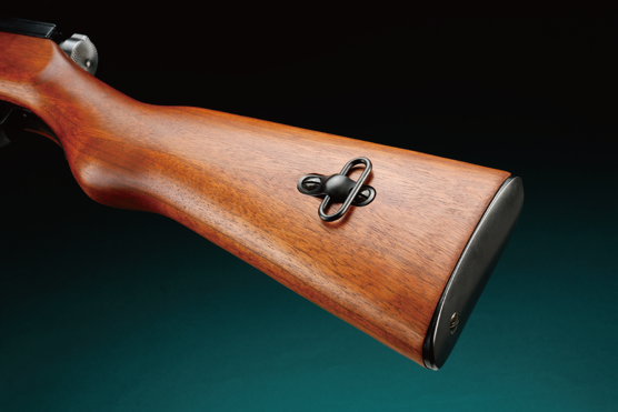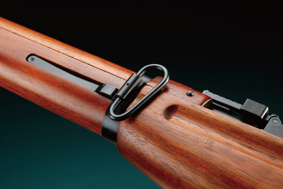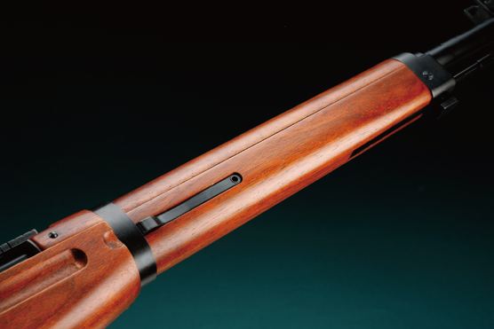日本軍が誇る三八式歩兵銃にも騎乗部隊向けに開発された三八式騎銃がある。バレルとフォアエンドを短くして、専用のリアサイトに換装。馬上時に背負いやすいように前後のスリングスイベルが左側に移設されている。タナカはこのモデルもブラックフィニッシュの鬼胡桃銃床仕様のVer.2ガスガンで製品化。騎銃の特徴であるリアサイトやスリングスイベルは忠実に再現されている。鬼胡桃製のストックのの質感や色合いも素晴らしい。