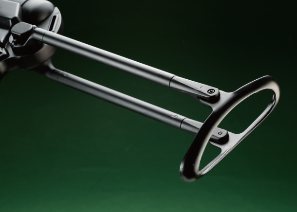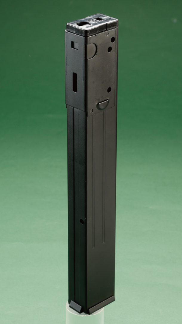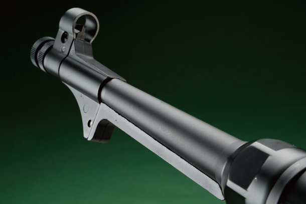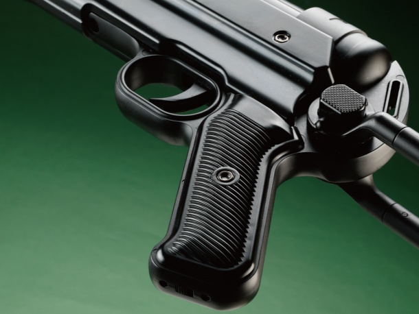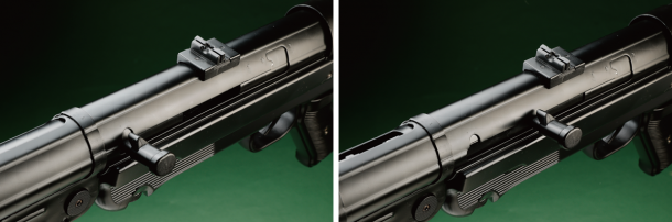 ストックはアンダーフォールディング式を採用。これにより可搬性を向上させただけでなく、素早く腰だめで掃射が可能なうえ、ストックを展開すれば精密な射撃もできるようになっている。ちなみにMP40は別名「シュマイザー」と呼ばれているが、その名の由来であるルイス・シュマイザーはMP40の設計には関わっていない。ここで紹介するMP40は、従来モデルではレシーバーカバー左側にエアガンオリジナルのセレクターレバーが追加されていたが、MP41と同様にボルトを前後させることでセミ・フルの切り替えができるようになった。