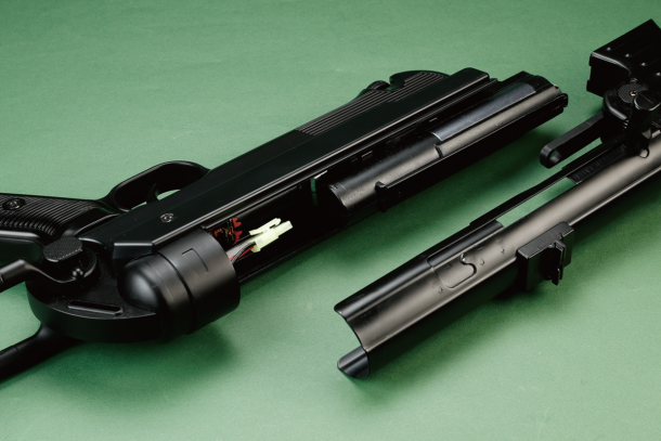 樹脂製のグリップパネルとレシーバーカバーの色はブラックとこげ茶の2種類。ロックボタンひとつで上下を分割できるため整備性も非常に高いことが魅力の一つ。歴史的に名銃と言われるMP40が電動ガンとして新たにリリースされたことは我々マニアにとって大変喜ばしいことであり、ヒストリカルゲームやサバゲで大活躍することだろう。