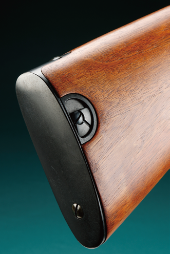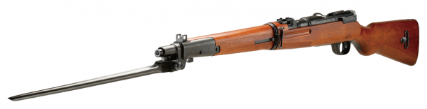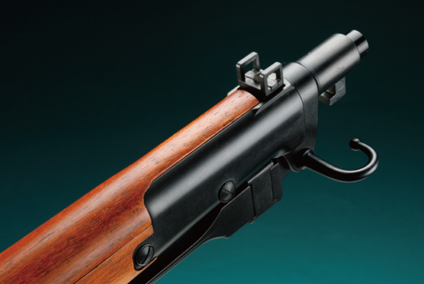 三八式騎銃をベースに明治42年(1909年)に開発が開始され、明治44年(1911年)に制式採用された四四式騎銃。バレル先端に折り畳み式の刺突型銃剣(スパイクバヨネット)が装着されており、折り畳み式の銃剣を装着した小銃は複数存在するが、四四式騎銃はその先駆けであった。タナカは四四式騎銃もブラックフィニッシュの鬼胡桃銃床仕様となったVer.2ガスガンで再現。折り畳み式銃剣は実銃同様に展開・折り畳みできる。