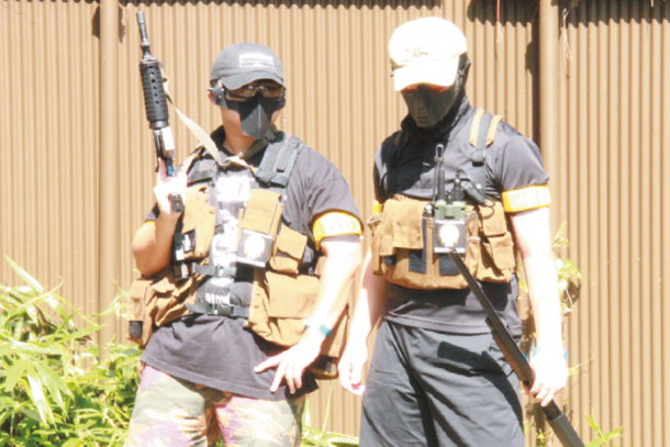 全身フル装備の参加者の姿も見られた。猛暑の中のイベントであるが、カッコいい装備を着ているだけでサバゲを気分から楽しむことができる