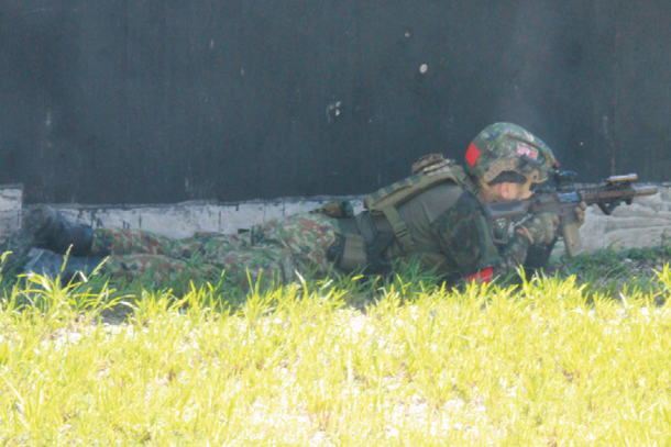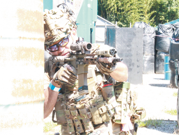全身をマルチカム迷彩で身を包んだ参加者は30mほど先の敵と交戦中。スリングまで同じ柄を使用しており、コーディネートの参考になる