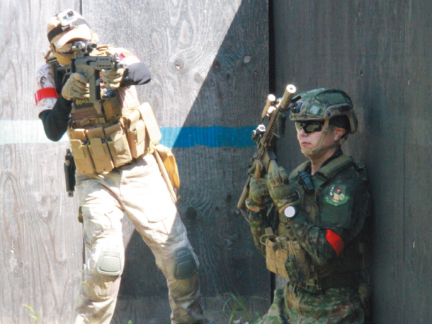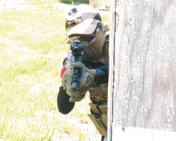 最前線でバリケードの角から敵を狙撃する参加者。プレートキャリアの予備マガジンはほとんど抜かれていることから、相当多くの敵と交戦をしていることが伺える