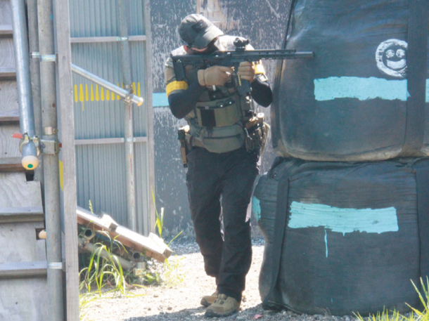 P-90を構える参加者。私服でラフなスタイルだが、非常に涼しげで理にかなっている。迷彩服がドレスコードではないため、今度も気軽にサバゲを楽しんでもらいたい