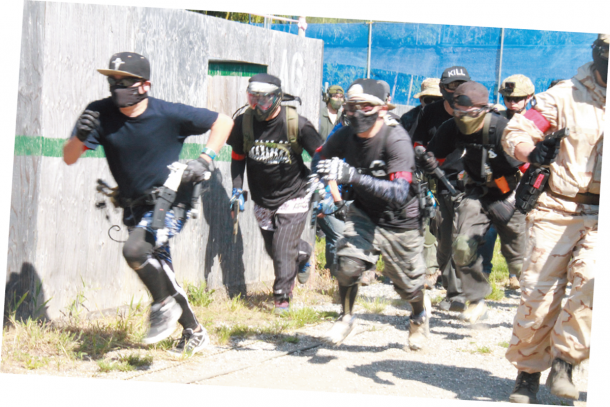 開幕ダッシュを決める参加者たち。スタート直後から前線を高い位置で維持して味方の上りを待つ、オーソドックスな作戦だがサバゲでは非常に有効であり、作戦は的中。黄色チームの分断に成功していた