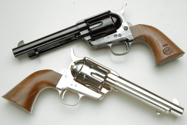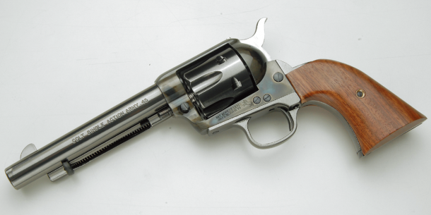 SAAのファーストジェネレーション(第一世代)のブラックパウダーモデル(黒色火薬モデル)。この2挺はタナカが以前、発売していたペガサス式ガスガンとモデルガンだ(現在はメーカー品切れ)。MGS3(MGSΔ)では、途中でスネークが入手するオセロットの黒いSAAは「ブラックパウダーモデル」と説明されている(無線で情報が聞ける)