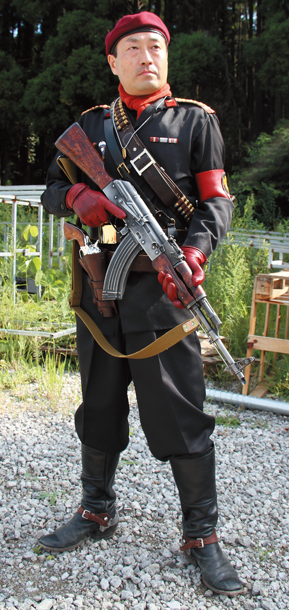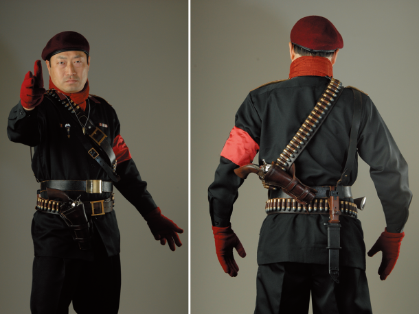 これは私のMGS3のオセロットのコスプレだ(2015年撮影)。私は昔からアクション映画などを見て「うわ!カッコイイ!」と思うと、その真似(コスプレ含む)をしたくなる人なので、私がオセロットのコスプレをするのは当然なのだ。今回、他の作品のオセロットのコスプレ写真も掲載するが、これらはすべてコスプレイヤーの友人たちのご協力で出来たものだ。いずれのオセロットのコスプレでも共通してこだわったポイントは、やはり銃とフルオーダーメイドで作ったガンベルト一式。それと私のコスプレは「本物のオセロット」と言ってもらえることが多いので(笑)本物がテーマ、小物類などを可能な限り実物のアイテムで揃えていることだ。このMGS3オセロットの場合、まずベースの黒い服は、現在メタルギアの公式コスプレイヤーやコスプレカメラマンとして活躍するZAN(ザン・ウー) さんに手伝ってもらった。軍服はゲームのオリジナルデザインだが、ロシア軍装に詳しい方にご協力いただき肩章、襟章、空挺章、略綬、コムソモールバッジ等の小物はすべて実物で揃えた。腰と肩のガンベルトは、プロの革職人にフルオーダーメイドで作ってもらったもの。もちろん本革製だ。実はMGS2とMGS3でのガンベルトのデザインは同じで、MGS2の資料を参考にしているが、当時のCGだと技術的に細かい部分まで描けずディテールが省略されているので、そこは実在する物のデザインへと修正している。劇中の雰囲気を忠実に再現するためにヒップベルトと肩の弾帯(バンダリア)は、実は3セットも作り直している。その2セット目をMGS3発売後にKONAMI本社へご挨拶に伺った時にアートディレクターの新川洋司さんに見てもらいアドバイスをいただき、3セット目でようやく完璧な物となった。ホルスターやポーチなどの小物類を換装することですべてのシーンのオセロットを再現可能で、この写真はMGO(オンライン対戦)バージョン。MGS3のコスプレは今も改良・ディテールアップを続けているが、いい加減、今の私では年齢的にもう無理がある。今後もイベント等で見かけたら、あたたかい目で見ていただけるとありがたい