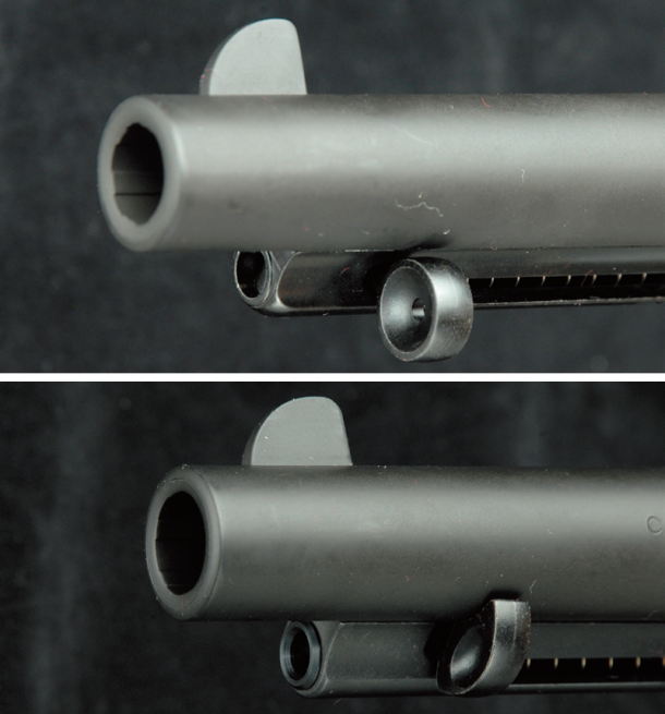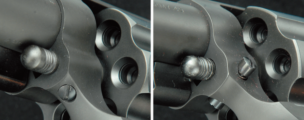 ざっくり解説するとSAAの1st.ジェネレーションのブラックパウダーモデルは、その後のスモークレスパウダーモデル(無煙火薬対応の強化モデル)とは形状的に2つの違いがある。そのひとつがエジェクターの指掛け(エジェクターヘッド)だ。写真上の円形(フルムーン/ブルズアイ)タイプが、民間市場で販売されたSAA(民間モデル)では1881年まで、米軍へ納入されたSAA(軍用モデル)では1884年まで使われ、それぞれ同年に写真下の半月形(ハーフムーン)タイプへと切り替わった