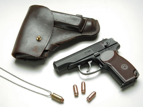 ここからは私がオセロットのコスプレのために揃えた銃とホルスターなどの紹介だ。この写真はKSCのマカロフとロシア軍の実物ホルスター、それと私が自作した“想い出のジャム弾ペンダント”。KSCのマカロフガスガンはガンスピンしようとするとトリガーガードが下へ開いてしまい回せないが、フレームにピン1本を貫通させることで解決している。ちなみにマカロフの実銃はトリガーガードを閉じるスプリングが強いため、ガンスピンは可能とのことだ(以前、海外在住の方に確認してもらった)。ペンダントは設定どおり、9mmのマカロフ弾を.45口径のSAAへ装填可能とするためのアタッチメントまで再現している