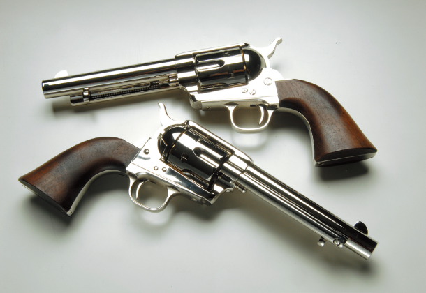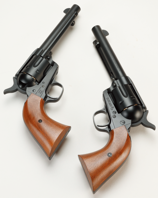 もうひとつの違いは、シリンダーの軸(ベースピン)の固定方法だ。左写真のフレーム前方からネジ1本で固定する「ダイアゴナルスクリュー」タイプが軍用モデルのすべてと、民間モデルでは1896年まで使われ、民間モデルは同年に右写真のフレームの左右からネジとナットで固定する「トランスバースピン」タイプへと改良された。19世紀の終わり頃は、銃の火薬がブラックパウダーから現在も使われる強力なスモークレスパウダーへと切り替わる時期だった。SAAも1900年頃にスモークレスパウダーに対応するように強化された。そのため銃器コレクターはダイアゴナルスクリューのフレームのSAAをブラックパウダーモデル、トランスバースピンのSAAをスモークレスパウダーモデルと分類しているのだ(写真はタナカのペガサス式ガスガン)