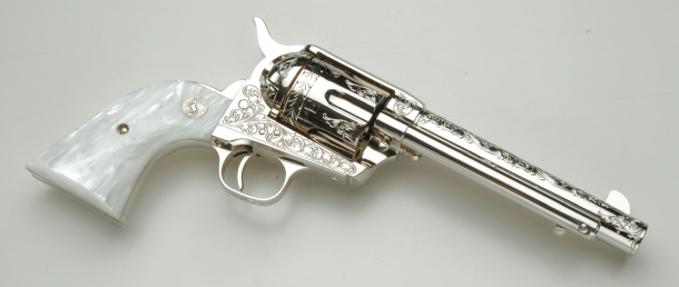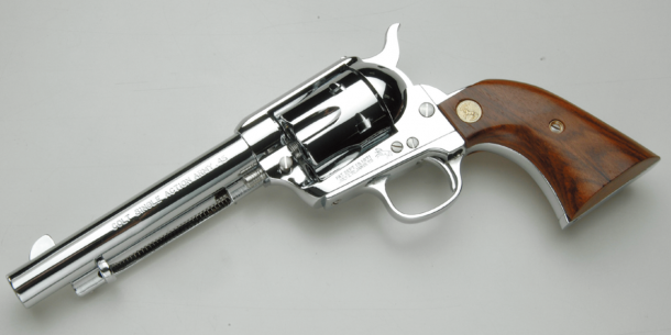 MGS3オセロットの愛銃、SAA 1st.ジェネレーション ブラックパウダーモデル バレル長5-1/2インチ。写真はランパント・クラシックのモデルガン(メーカーは既に活動停止)。劇中では黒だが、筆者はガンプレイヤー(ガンスピナー)なので回した際に技が映えるようにシルバーモデルを愛用している。ここだけはパフォーマーとしてのこだわり。ランパントの1st.ジェネレーションのシルバーモデルはハンマーやトリガー、スクリューが黒だったが、オールシルバーへカスタムした