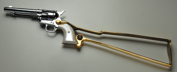 MGS3の劇中でオセロットがSAAに取り付けるスケルトン ショルダーストック(クラフトアップル製、現在絶版)。このショルダーストックはモーションキャプチャーの撮影現場へ私が遊びで持ち込んでいたもので、これが小島監督の目に留まり、本編へ登場することとなった。この写真の銃はハートフォードのモデルガン。ショルダーストックは最近RIGHTからもタナカ・ハートフォード用が発売されたが現在は品切れ