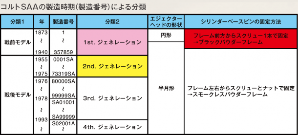 SAAは1873年の製造開始以来、各部で小改良(マイナーチェンジ)が繰り返されており、製造時期により細部がわずかに異なる。そのため実銃のコレクターはSAAを製造時期(製造番号)により1st. / 2nd. / 3rd.ジェネレーションとかブラックパウダー/スモークレスパウダーモデルなどと呼んで分類している。SAAを正しく詳しく語るなら、この表の分類は覚えないと話にならない