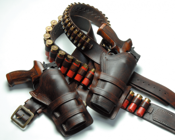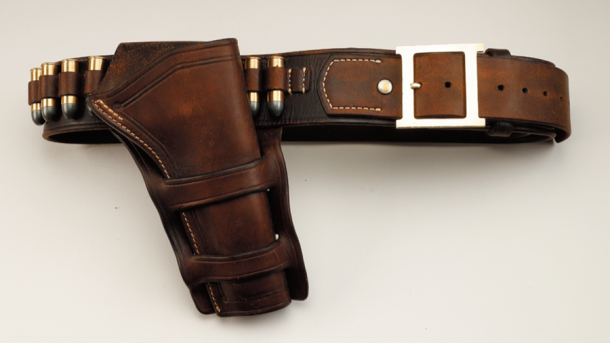 MGS2とMGS3のガンベルトは、ホルスターはメキシカンループやシャイアンと呼ばれる標準的なタイプだ。新川さんから直接教えてもらったデザインのこだわりポイントは、バックルの四隅がHの字を横に寝かせたように角が突出していることと、カートリッジループの両端に少し張り出しがあることだ。そのため真鍮製のバックルも特注の削り出しで作ってもらった