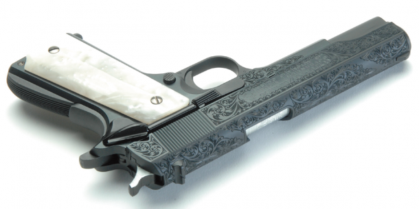 もちろん何の戦術的優位性(タクティカルアドバンテージ)もないエングレーブのSAAも再現している。かつて六研からバレル長4-3/4インチのみで彫刻入りのタナカのペガサス式SAA(初期型)が発売されていた。それを入手し、タナカへ部品注文で5-1/2インチのバレルを取り寄せ、六研の彫刻モデルを彫った井浦勝雄 先生に同じ模様で彫ってもらい、ニッケルメッキを施したこだわりの逸品だ。なお彫刻SAAはMGS3ではハーフムーンのエジェクターヘッドにフレームのトランスバースピンまで見てとれたが、MGSΔではリアサイトがVノッチ(〜1931年まで。1931年にUノッチへ改良)で描き込まれているのが確認できたので1st.ジェネレーションのスモークレスバウダーモデルと解釈できる