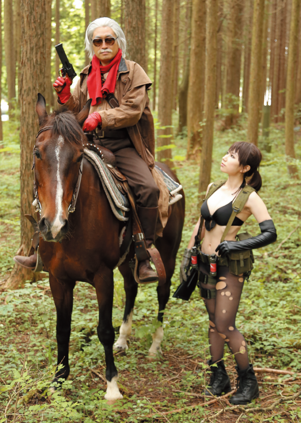 MGSVのオセロットのコスプレ(2016年撮影)。これはメタルギアコスプレイヤーの親しい友人(潜友)たちと一緒に、私が当時通っていた静岡県御殿場市の乗馬クラブ(現在はクローズ)で撮影したものだ。MGSVではゲームに登場する銃はすべてオリジナルデザインとなり、オセロットは「トルナード6」という中折れ式のリボルバーを愛用する(新川さんのデザイン画ではSAAで描かれている)。当時トルナード6までの再現は難しかったため、似たような外観のマルシンのマテバリボルバーで代用している (撮影:ZAN 、クワイエット:染屋ウメ)
