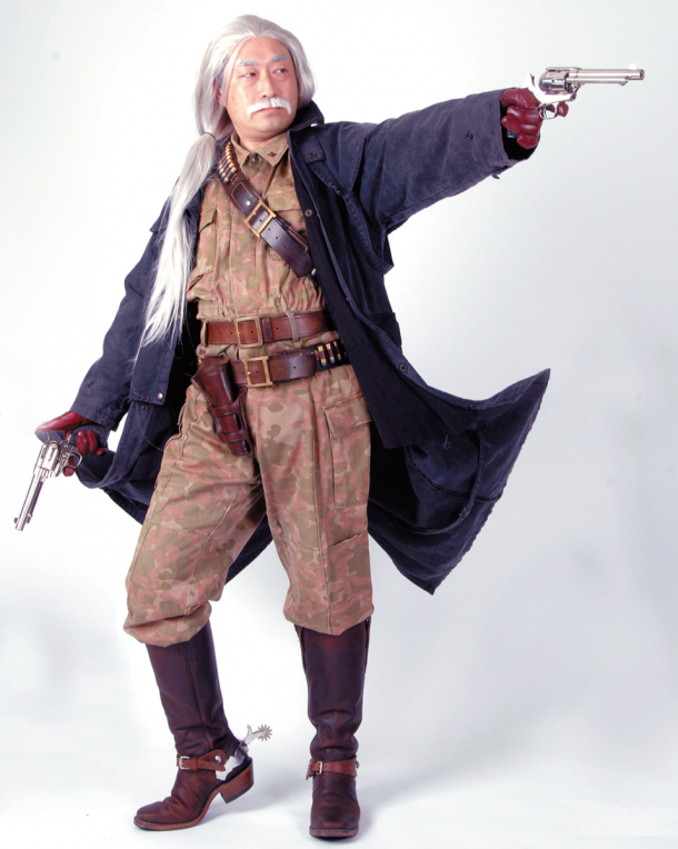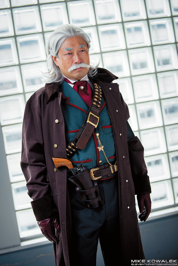 MGS ザ・ツインスネークス版のリボルバー・オセロットのコスプレ(2017年撮影)。メタルギア30周年を祝う友人達で開いたパーティで初披露。私が長年一番やりたかったコスプレだ。ヒップベルトもバンダリアもMGS2&3版とデザインがまったく異なるため(袈裟懸けの向きやスリーピースバックルなど)一式すべてをオーダーメイドで作り直した。ベルトの製作者はハートフォードのオフィシャル革職人でファストドロウシューターの先輩のトミー井浜さんだ。バンダリアの真鍮製バックルは私が根性で削り出した (撮影:Mike Kowalek, ELEVENTHPHOTOGRAPH.COM )