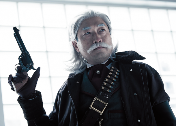 MGS2 タンカー編のリボルバー・オセロットのコスプレ。実は最初に揃えたオセロットの服装はこれだったが、当時はオールバックの白髪のウィッグがまだなくて『METAL GEAR SOLID V THE PHANTOM PAIN』(以下MGSV)が発売された2014年になってから10年越しでようやくこのコスプレができた。ちなみにMGS2 プラント編のオセロット(ベージュの背広を着用)も、きちんとした写真はまだ撮っていないができるようになっている
