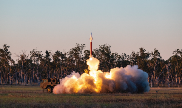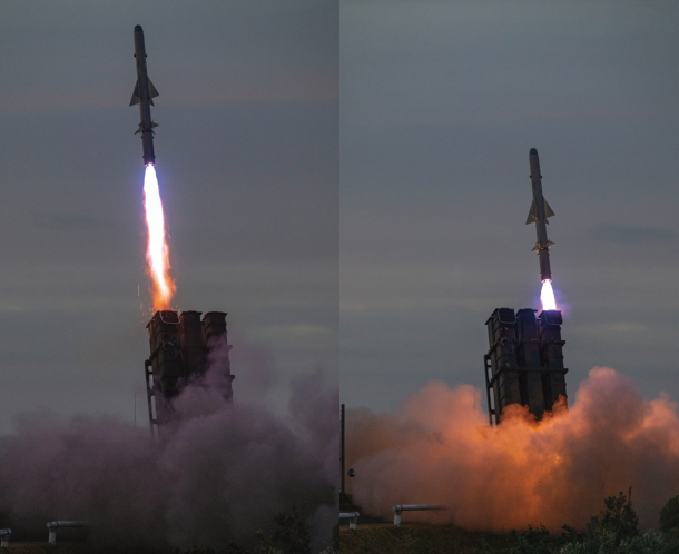 1回目の射撃訓練は、7月12日に行われた。同演習場では、日本の前に、米豪及び韓国軍等も射撃訓練を実施していたのだが、そちらの訓練が大幅に遅れてしまったため、当初お昼頃計画されていた日本の射撃は、17時半までずれ込んでしまった。夕陽に照らされた発射機から飛び出したミサイルは、見事標的機を破壊した。