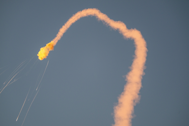 発射機の周りにいた隊員たちが退避し、いよいよ発射に向けた最終段階となったのが午前6時だった。ここでようやく朝日が昇り始め、うっすらと辺りを照らし出す。