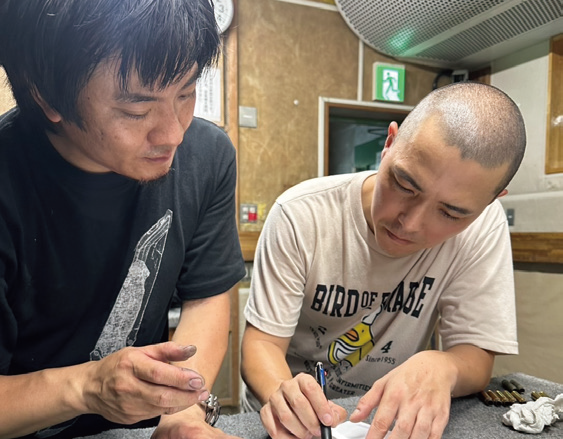 「I 川商店」で活躍する作家。写真左が市川さん。独自性の高いデザインと精度の高い仕上げの作品が人気で、最近のショーでは毎回完売を果たす。今回は信頼する仲間たちとも相談しながら、市川さん流のユーティリティモデルを制作することに。