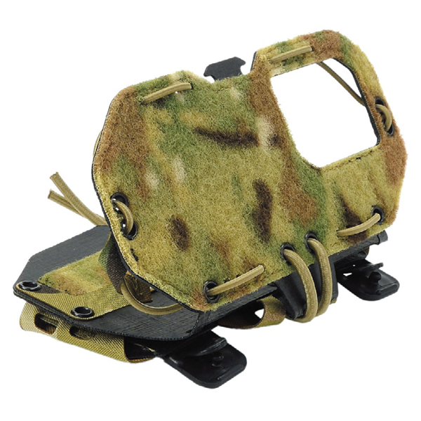 スマートフォンをMOLLE装備するポーチ。フラップ側にスマホ本体をショックコードで保持し、フラップを開くと画面が地面と平行になり、閉じるとカメラが正面を向くデザイン。