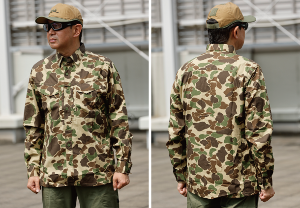 2WAYストレッチのリップストップ素材が使われた定番のタクティカルシャツ。メガネ用のループ、フラップ付きの胸ポケットにはジッパーポケットも設けられている。新色としてダックハンターカモが加わった。