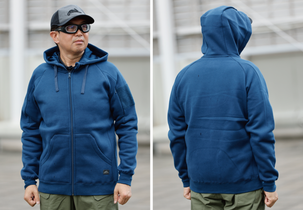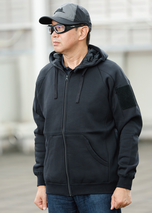 表地にコットン、裏地に保温性に優れたポリエステルフリース、袖口にエラスティックニットを使用することで、動きやすい自然な着心地を実現したフーディ。フロントポケットに加えて隠しポケット、左上腕部のベルクロフックなどが備わっている。