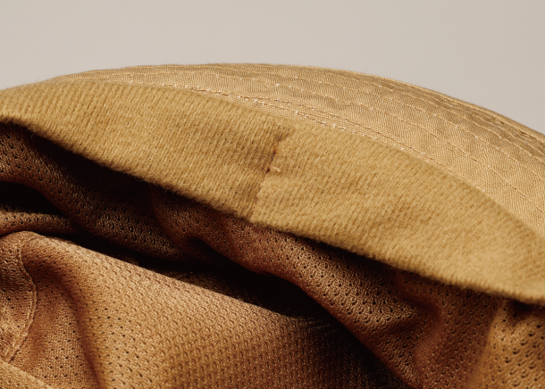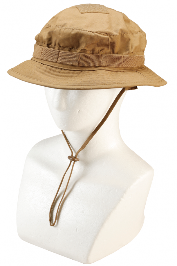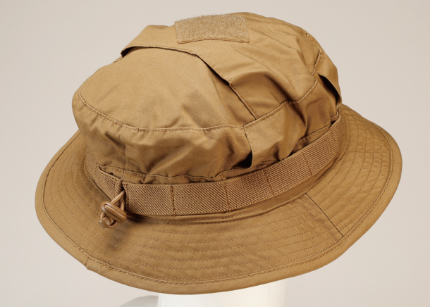 イギリス連邦軍が使用していた狭めなつばが特徴のブッシュハットをモチーフにしており、素材はコットン60%/ポリエステル40%。頭頂部を中心にベンチレーションが設けられており蒸れを防いでいる。着脱可能なサイズ調整用ドローコード付き。