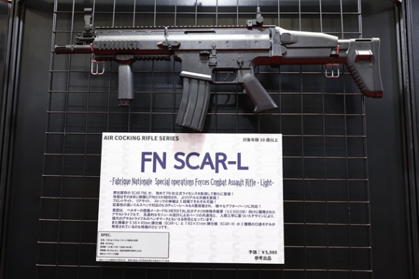 すでにラインアップされている対象年齢10歳以上のエアコッキングガンSCAR-LがFNのオフィシャルライセンスドモデルとしてバージョンアップして登場。ショートバレル仕様が再現され、マルチフォールディングストックは実銃同様に伸縮・折り畳みできる。予価¥5,980、参考出品