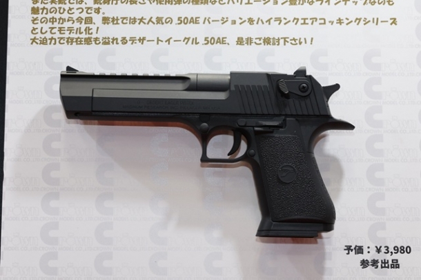 こちらの.50AE弾仕様のデザートイーグルは、リアルさにこだわったハイランクエアコッキングガンシリーズとしてリリース予定。リアルな刻印に加えてバレル上面にピカティニーレールが設けられている。予価¥3,980、参考出品