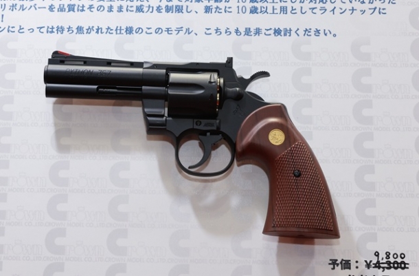 スミス&ウェッソンとコルトのダブルアクションリボルバーをライブカート式のエアコッキングガンとガスガンで豊富にラインアップしているクラウンモデル。対象年齢10歳以上用のガスリボルバーは意外にも初となる。第1弾としては選ばれたのはコルトパイソン4インチ。ダブルアクショで連射ができるのが魅力だ。予価¥9,800、参考出品