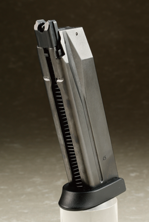 ガスブローバックガン化に際しては、直径15mmの大口径シリンダーを採用したことで.45口径弾さながらの迫力あるブローバックを味わうことができる。特徴的な通称スパイダーマングリップと呼ばれるグリップは実銃から採寸したデータを基に再現されており、握ってみると納得の仕上がりになっている。