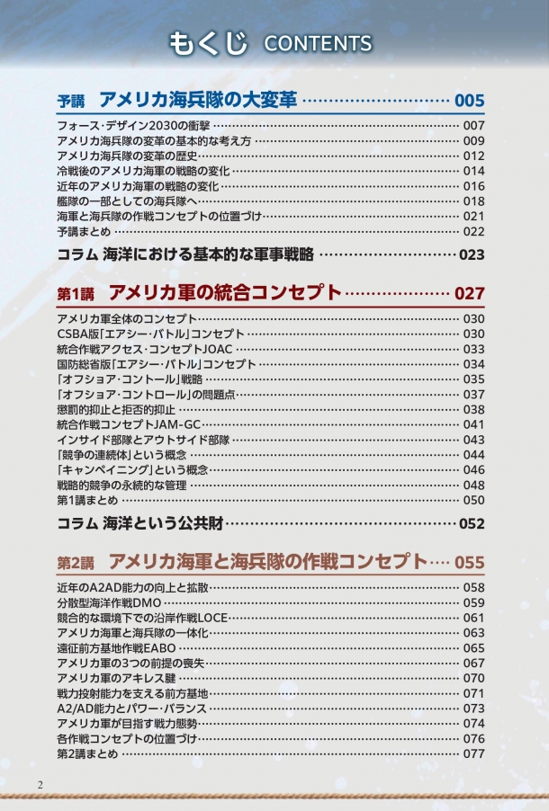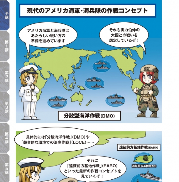 そこで、本書では現在進行中のアメリカ海兵隊の大規模な変革と、それを必要としている海兵隊やアメリカ海軍、さらにはアメリカ軍全体のあたらしい用兵思想、それを実行するために編成される海兵隊のあらたな部隊とその装備、指揮統制の方法などを、イラストとともにくわしく解説していきます。