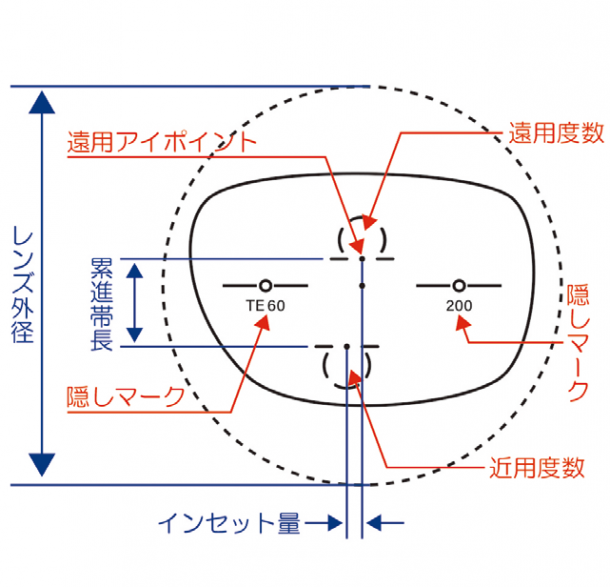 隠しマークには、レンズの種類、屈折率、加入度(遠くを見るための度数と近くを見る度数の差)数、累進帯長(遠くを見る部分と近くを見る部分までの距離)などが記入されている。遠用アイポイントは、メガネを掛けたときの黒目の位置に合わせるポイントである。