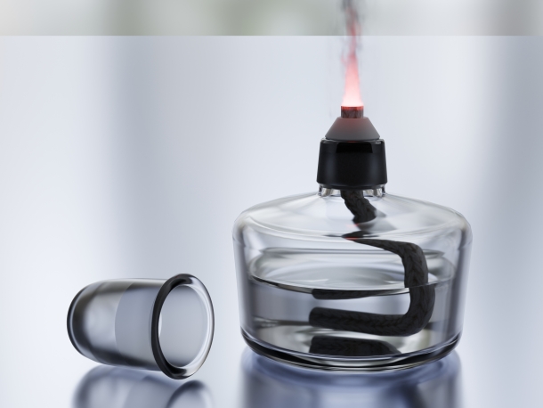 アルコールランプの構造は実にシンプルで、ガラス製の容器の中にアルコールが入っていて、そこからひも状の芯が伸びています。その芯は、毛細管現象でアルコールを吸い上げていき、芯先に火を近づけることで燃える仕組みです。