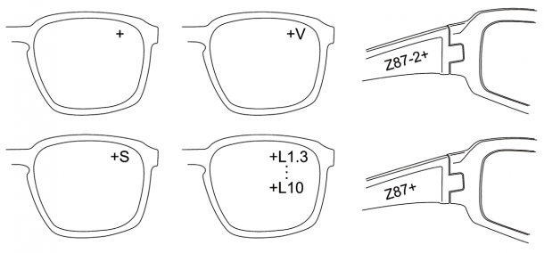 「Z87+」表示がある場合、メーカー純正の度なしレンズに対してのみ規定の高速度衝撃と加撃衝突に耐えられる耐衝撃フレームである。ただし、視力矯正者がメーカー純正の度付きレンズ取り付けアダプターである専用RXインサートを併用することで「Z87+」耐衝撃フレームとして使用可能だ。