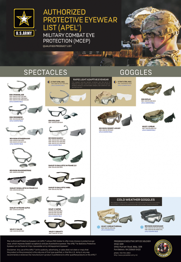 APELの製品は、軍事戦闘や訓練での使用を承認されている唯一のアイプロテクションである。APELリストを見ることで、MCEPと類似形状の保護メガネやスポーツグラス、ミリタリー調アイウェアと区別可能で、隊員が誤って着用しないための資料でもある。