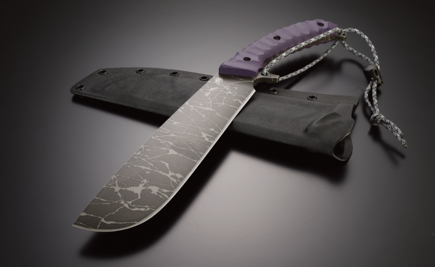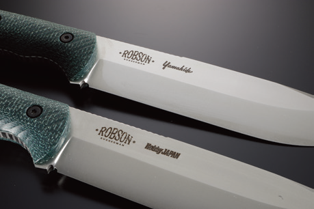 三者での打ち合わせの末、テーマが決まり、アウトドアをより意識させるグリーンのジュートマイカルタをハンドル材にして、山秀とホビージャパンのロゴをさりげなくブレードに入れるというオリジナルのアレンジを施した。