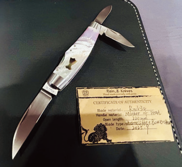 松田昌之さんは、はじめの一歩をそう振り返る。稚拙な出来だったが、つくるのは楽しかった。だから、仕事の合間を縫って、自分のモデルをつくっていった。「猫と紫が好きだから」という理由で、マークやテーマカラーも決め、ナイフショーにキクナイフとして出展した際に、隅っこに置いてみた。