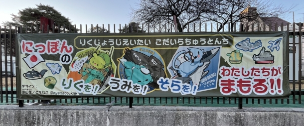 今回、小平駐屯地と小平学校の皆様のご厚意によって、じえねこたちをモデルとした自衛隊広報横断幕が完成しました。